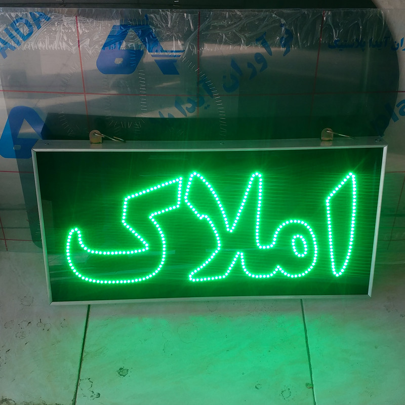 سایز 40 در 80 یکطرفه رنگ سبز چشمک زن ضدآب مناسب نصب بیرون قاب آلومینیوم پلکسی براق قلاب آویز و دوشاخه برق